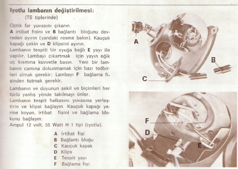 - (F) Bağlama Fişi ve H1 Ampul: Yeni H1 iyotlu ampul, reflektörün içindeki oyuya yerleştirildi ve yenilenen Tespit yayı (E) ile sabitlendi. Kablo, bağlama fişine sağlamca bağlandı.