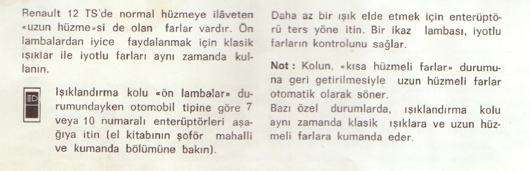 Araçtaki aydınlatma kolu “ön lambalar” konumundayken, şoför mahallindeki 7 veya 10 numaralı özel enterüptörler (anahtarlar) vasıtasıyla bu iyotlu farlar devreye alınıyordu. Sistemin en akıllıca tasarlanmış özelliklerinden biri ise pratikliğiydi: Sürücü aydınlatma kolunu “kısa hüzmeli farlar” durumuna geri getirdiğinde, iyotlu uzun farlar otomatik olarak sönerek karşıdan gelen sürücünün gözünü almayı engelliyordu.