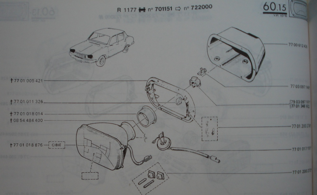 Şema İncelemesi ve Parça Detayları: Yukarıdaki orijinal fabrika çiziminde (R 1177 -> n° 701151’den n° 722000’e kadar olan şasiler), Cibié far grubunun “patlatılmış” (exploded view) montaj detaylarını görüyoruz.