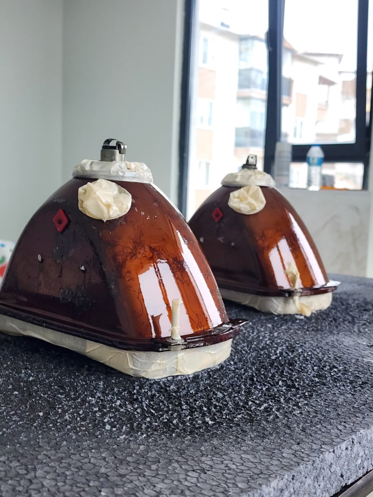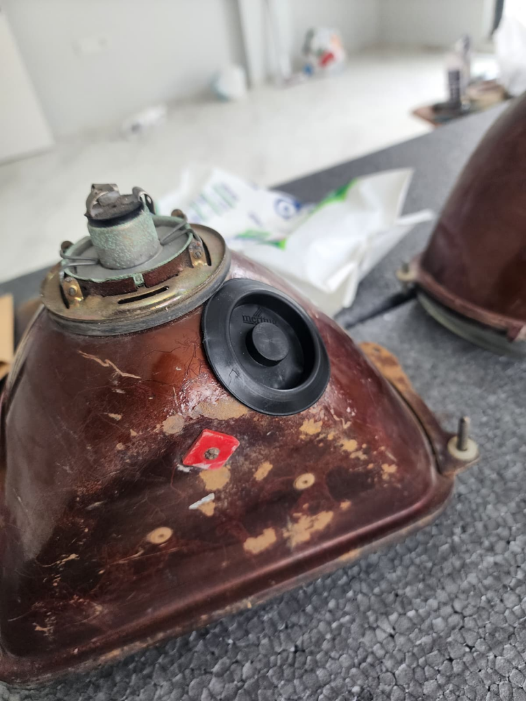 Sürece başladığımızda şanslıydık ki farların iç krom reflektörleri yıllara meydan okumuş ve oldukça temiz durumdaydı. Bu sayede, orijinalliği bozacak herhangi bir yeniden krom kaplama işlemine ihtiyaç duymadık. Yıpranmış görünen dış kasalara ise ağır bir müdahalede bulunmak veya yeniden boyamak yerine, o yaşanmışlık hissini koruyarak yüzeyi canlandırmak amacıyla sadece şeffaf vernik uygulaması yaptık. Farların orijinal yapısına sadık kalarak, ekstra bir işleme gerek duymadan temizlik ve koruma aşamasını tamamladık.